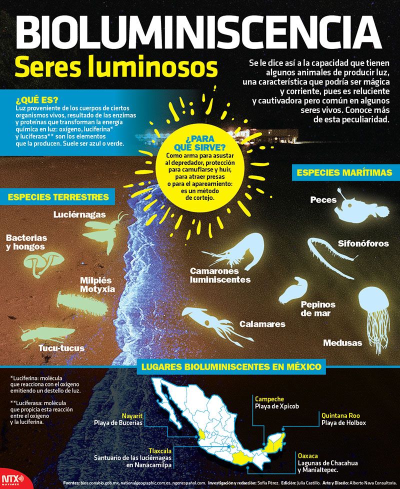 En la naturaleza existe un fenómeno similar llamado bioluminiscencia. ¿Pero qué es y cómo funciona? La bioluminiscencia es la emisión de luz por parte de un organismo vivo, esto se logra por medio de una reacción bioquímica (Kahlke & Umbers, 2016). Se estarán preguntando ¿y qué sucede durante esta reacción química? Bueno pues los organismos bioluminiscentes cuentan con un sistema complejo conocido comúnmente como “llave-cerradura”, el cual (como su nombre lo indica) requiere de una enzima (cerradura) y de un sustrato (llave) para poder llevar a cabo la reacción química. En el caso de los organismos bioluminiscentes, estos cuentan un sustrato llamado luciferina, que al unirse a la enzima luciferasa permite que éstos emitan luz y la puedan controlarla.