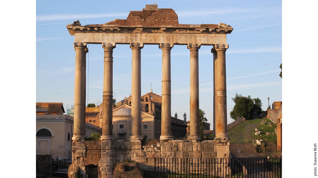 Lamentablemente si deseamos viajar al templo y ofrecer un corderito a Saturno, se darán cuenta que el templo ubicado en la zona sudeste del Foro en Roma no es el original, sino uno reconstruido entre 42 y 31 a.e.c. e incluso esta reconstrucción fue dañada en un incendio por lo que fue restaurado en el siglo cuarto e.c. si nos acercáramos a la arquitrabe, una voz del pasado que nos cuenta una historia en forma de inscripción en piedra nos diría:
