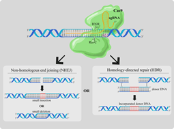 En la naturaleza, el sistema CRISPR – Cas puede llegar a necesitar de hasta 9 proteínas y dos ARN; sin embargo, la comunidad científica ha logrado reducir este sistema a sólo dos componentes: el primero de ellos es la proteína conocida como Cas9, la cual corta enzimáticamente (reconoce una secuencia específica de ADN y lo corta en ese punto) el ADN en presencia del segundo componente conocido como ARN guía o sgARN. El sgARN trabaja en conjunto con la proteína Cas9, determinando la secuencia específica de ADN a cortar. Para poner a el sistema CRISPR – Cas9 en acción, se necesita de una secuencia de ARN de 20 nucleótidos de largo (la cual se encuentra en el ARN guía), homóloga a una secuencia de ADN específica e inmediatamente localizada adyacente al protoespaciador de ADN de tres pares de bases (PAM), este complejo permite que Cas9 se posicione en el ADN de doble cadena. Posteriormente, la proteína Cas9 realiza un doble corte en el ADN, cuando este corte se repara mediante la unión de los extremos (conocidos como extremos no homólogos), se generan mutaciones debido a la inserción y/o deleción de material genético (depende de la modificación que se busque tener).