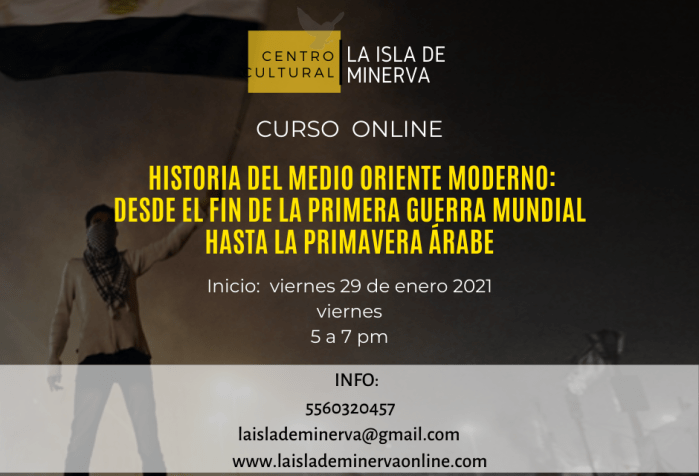 Objetivo Revisar los procesos que condujeron a la formación del Medio Oriente tal y como lo conocemos en la actualidad; desde la II Guerra Mundial hasta los eventos recientes acaecidos … Seguir Leyendo Curso: Historia del Medio Oriente Moderno: Desde el fin de la Primera Guerra Mundial hasta la Primavera Árabe